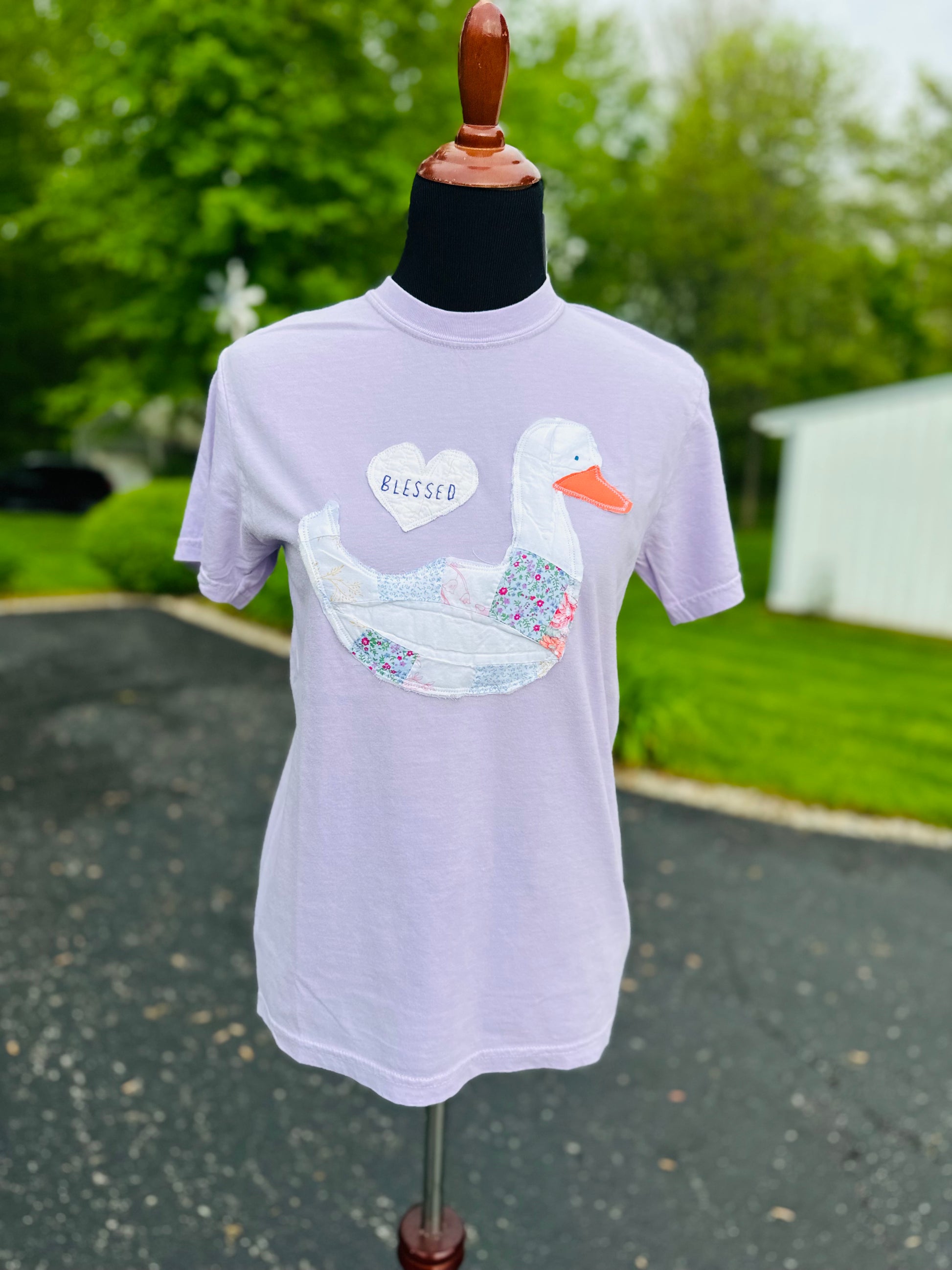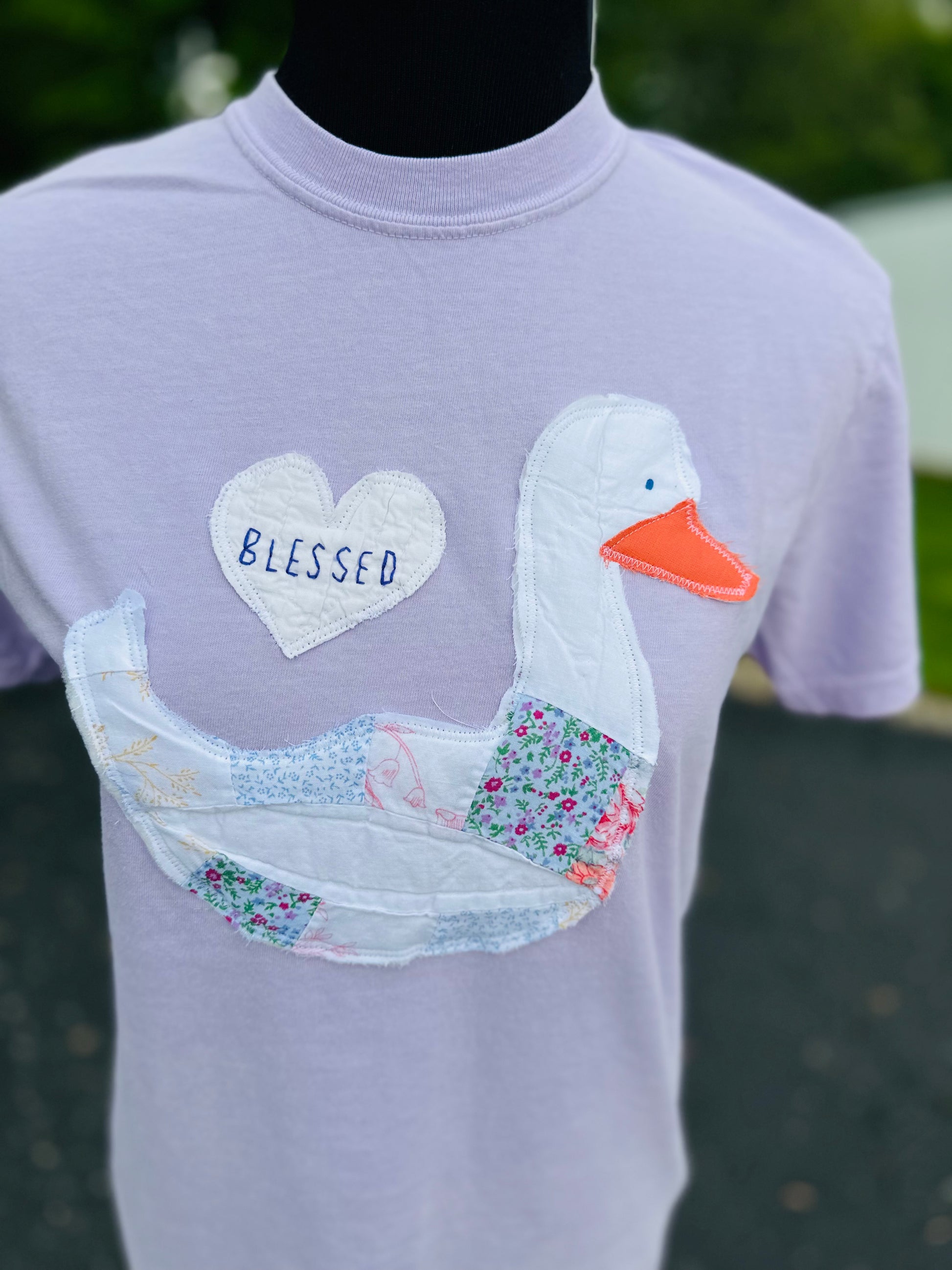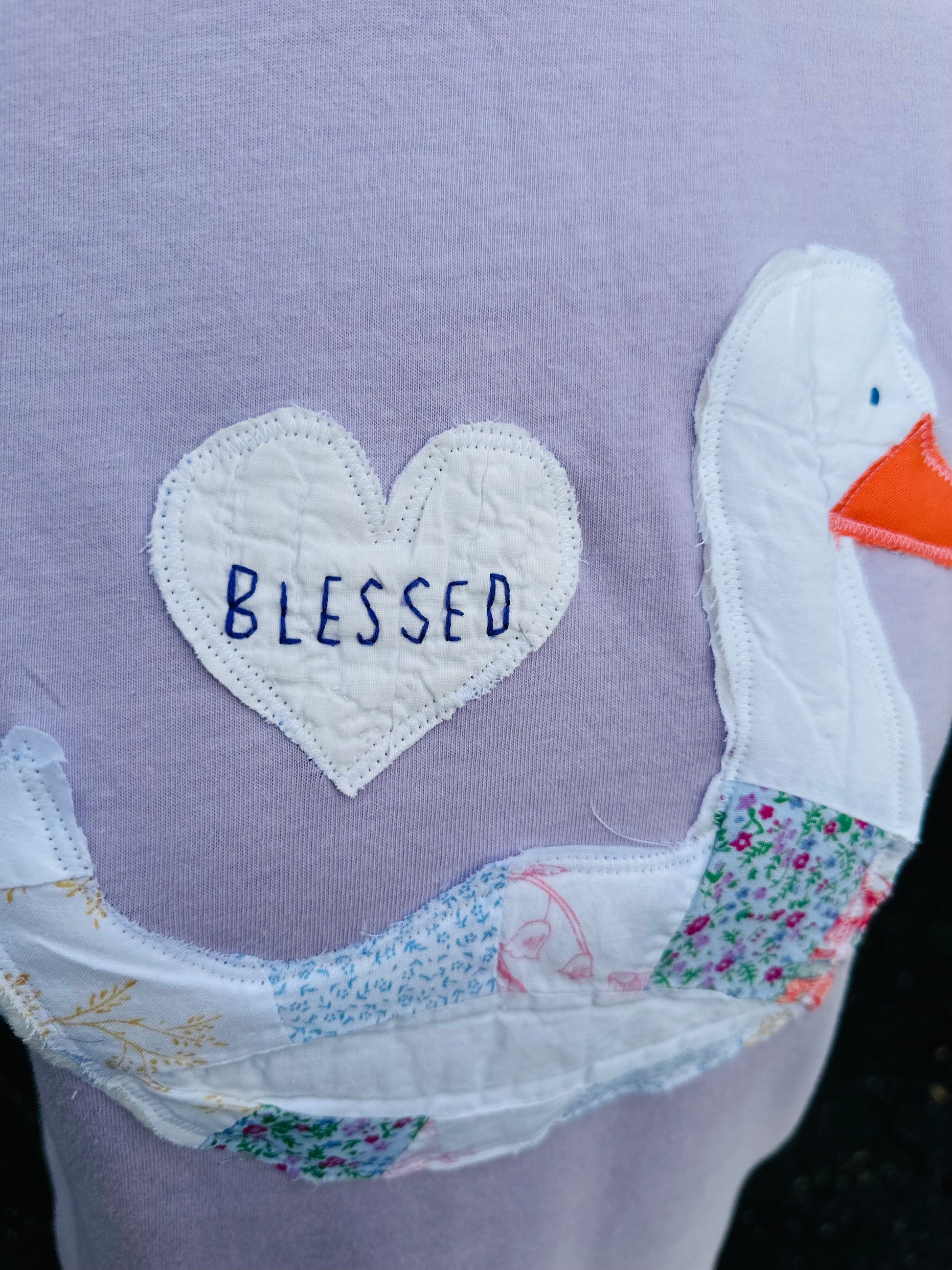 Blessed Goose Tee – Vintage-Inspired Appliqué Shirt, Light Purple