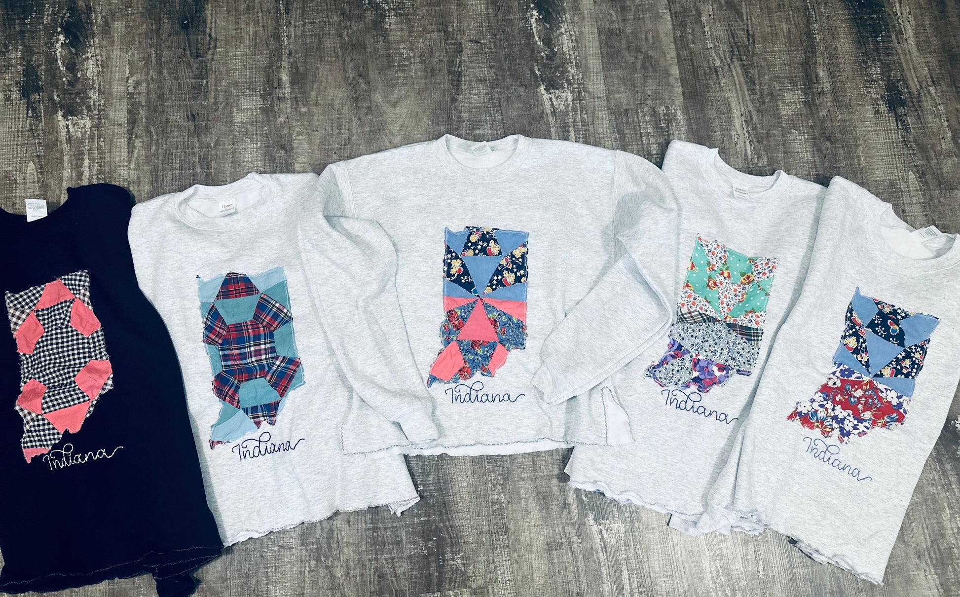 Show off your Indiana pride with this unique, handmade quilt sweatshirt! Each sweatshirt features a beautiful, upcycled quilt patchwork in the shape of Indiana, hand-embroidered with "Indiana" for a personalized touch. The design is crafted on cozy sweatshirts with an option to remove the band, split sides, and raw hem, giving it a relaxed and trendy look or keep the band on for the classic crewneck fit. Perfect for anyone who loves vintage style, sustainable fashion, and Midwest charm.