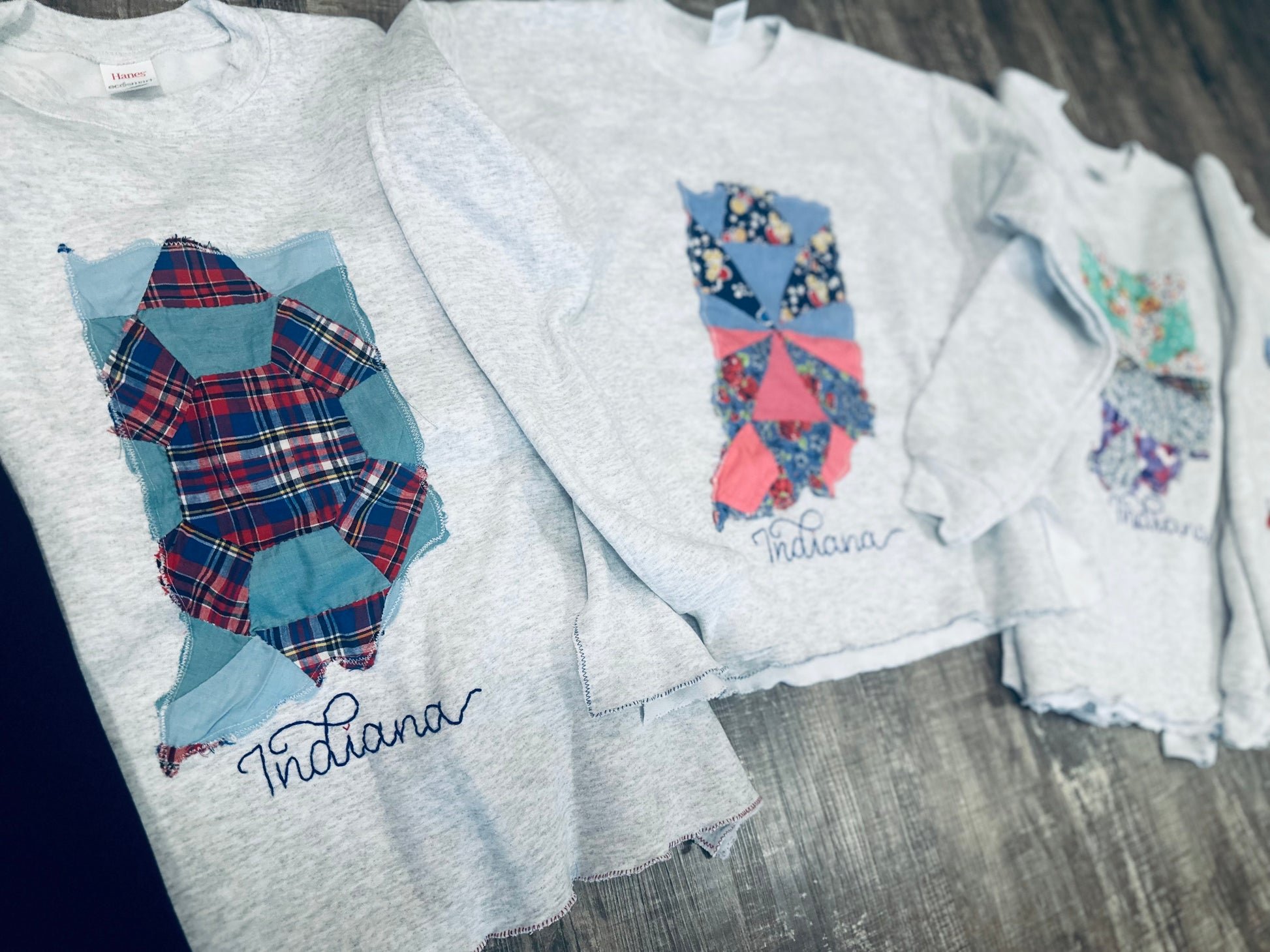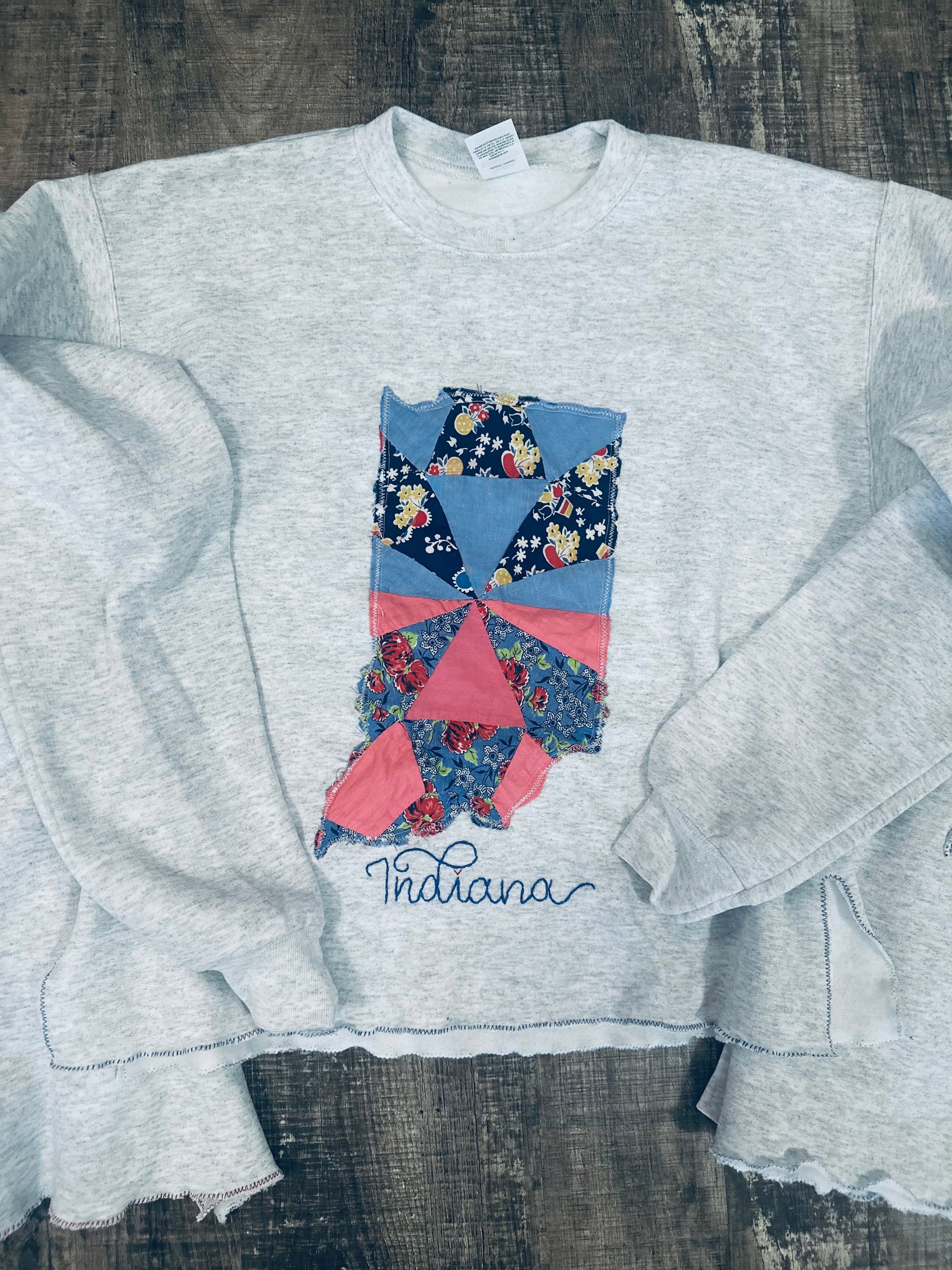 Handmade Indiana Quilt Sweatshirt – Upcycled Patchwork with Embroidered State Outline
