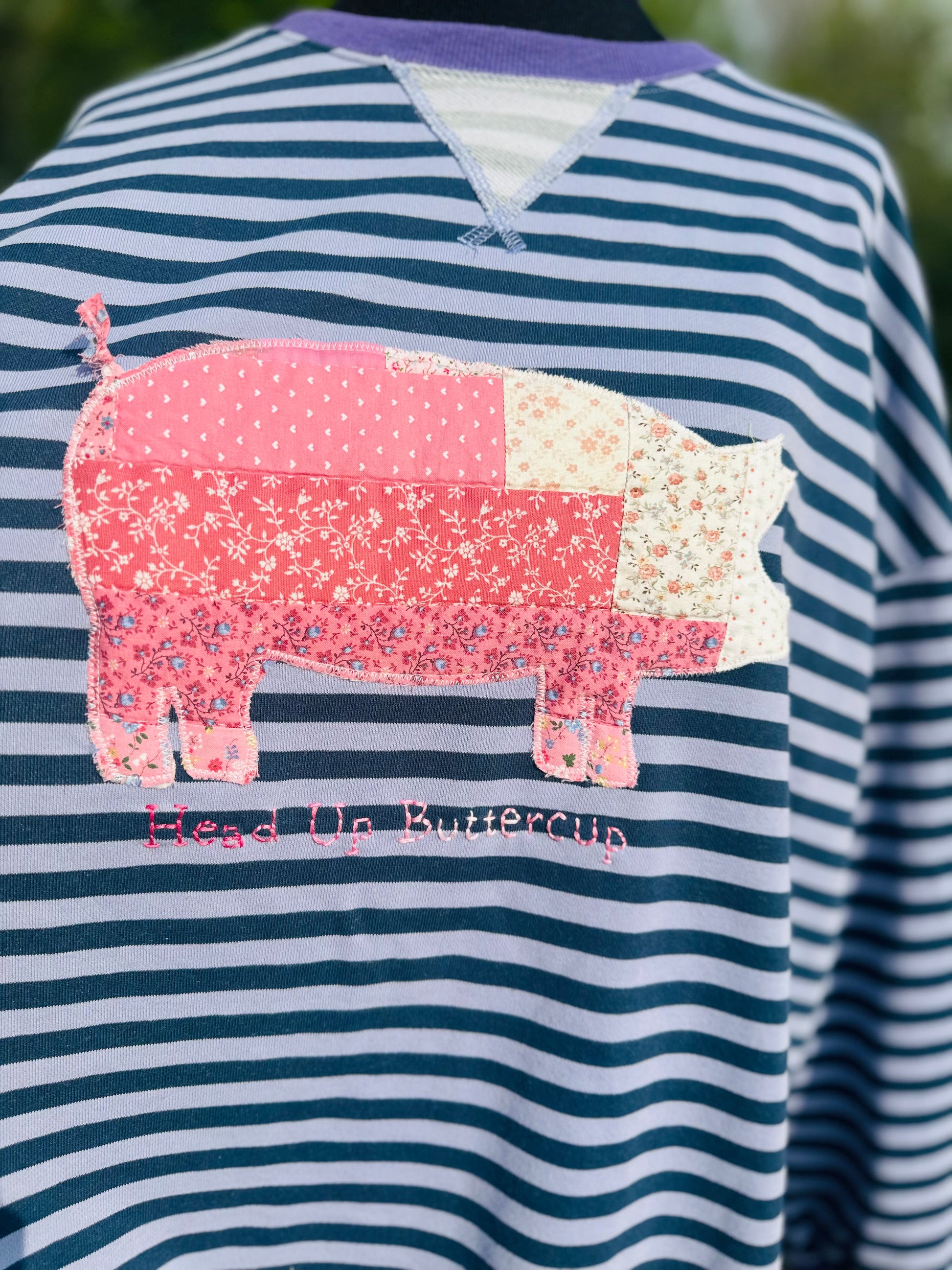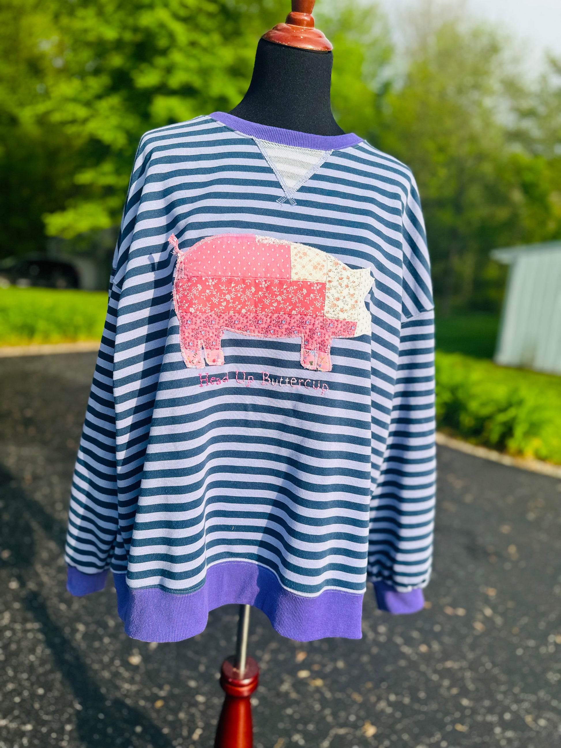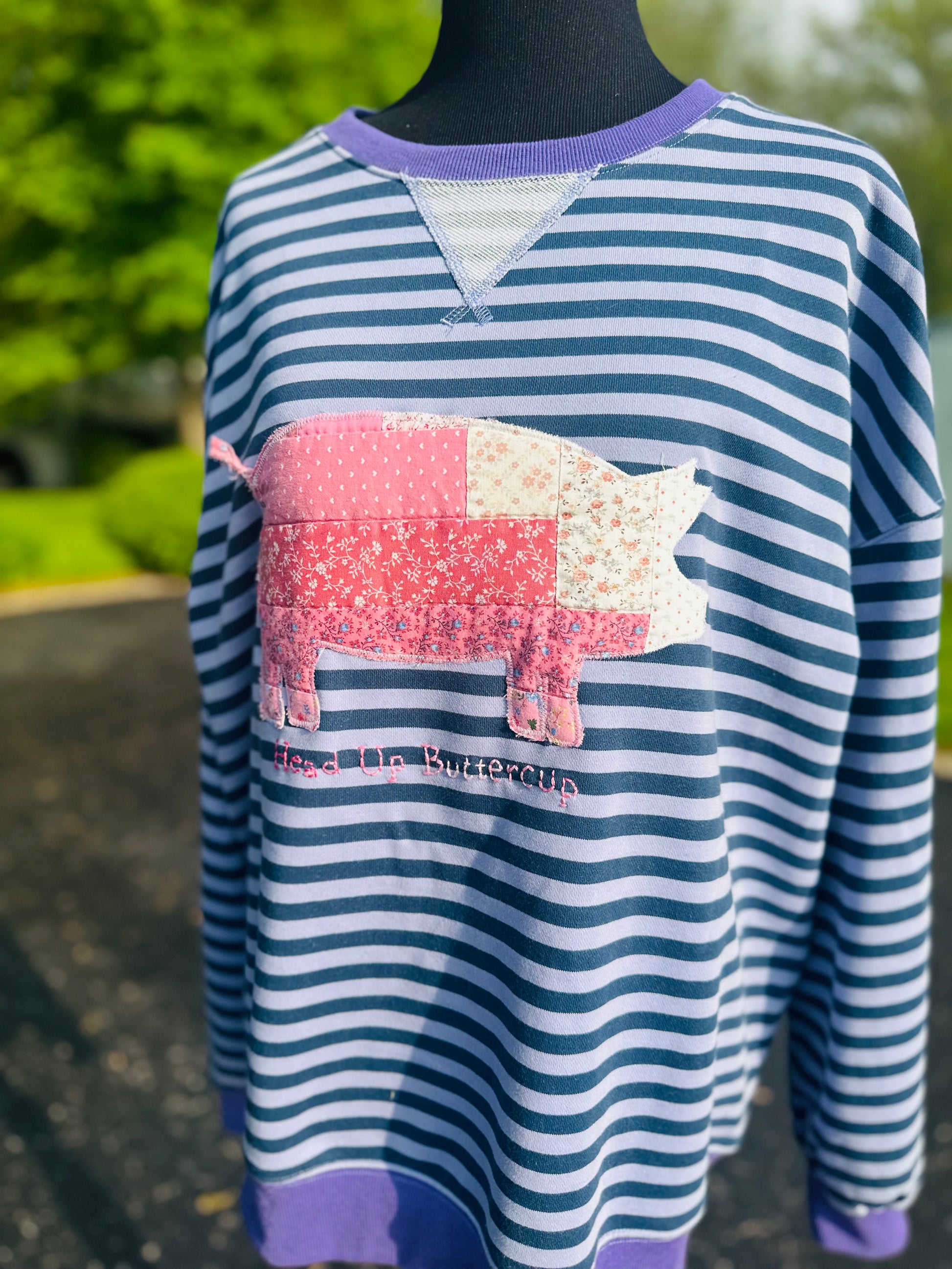 Head Up Buttercup Piggy Sweatshirt – XXL Striped Crewneck with Vintage Quilt Pig Appliqué & Hand Embroidery