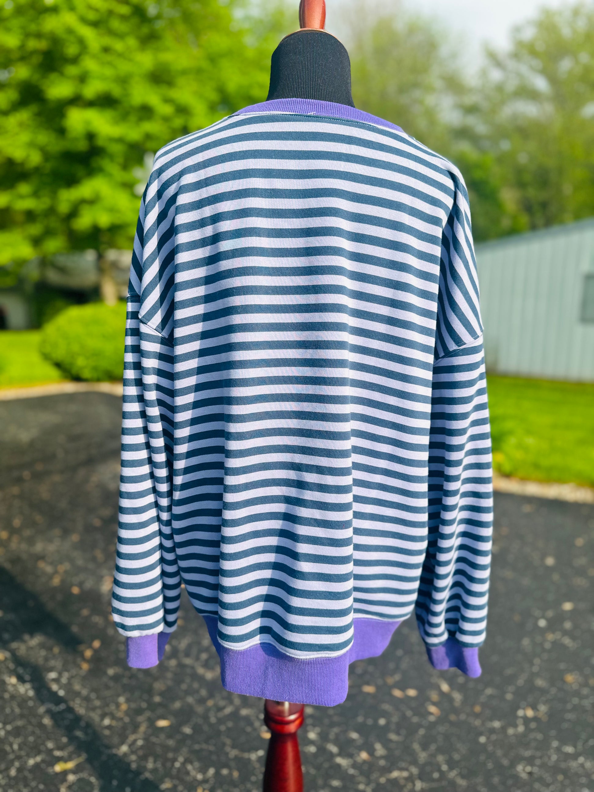 Wrap yourself in comfort and a little country wisdom with this delightfully cozy crewneck sweatshirt. Made in a relaxed XXL fit and classic navy-and-lavender stripes, this piece brings together old-fashioned charm and farmhouse whimsy with a patchwork pig appliqué—lovingly cut from a vintage quilt and stitched right at the heart.