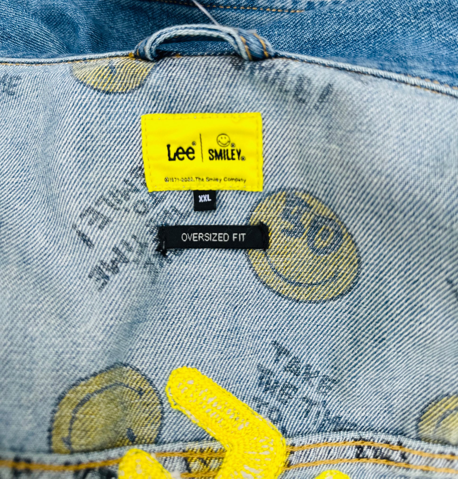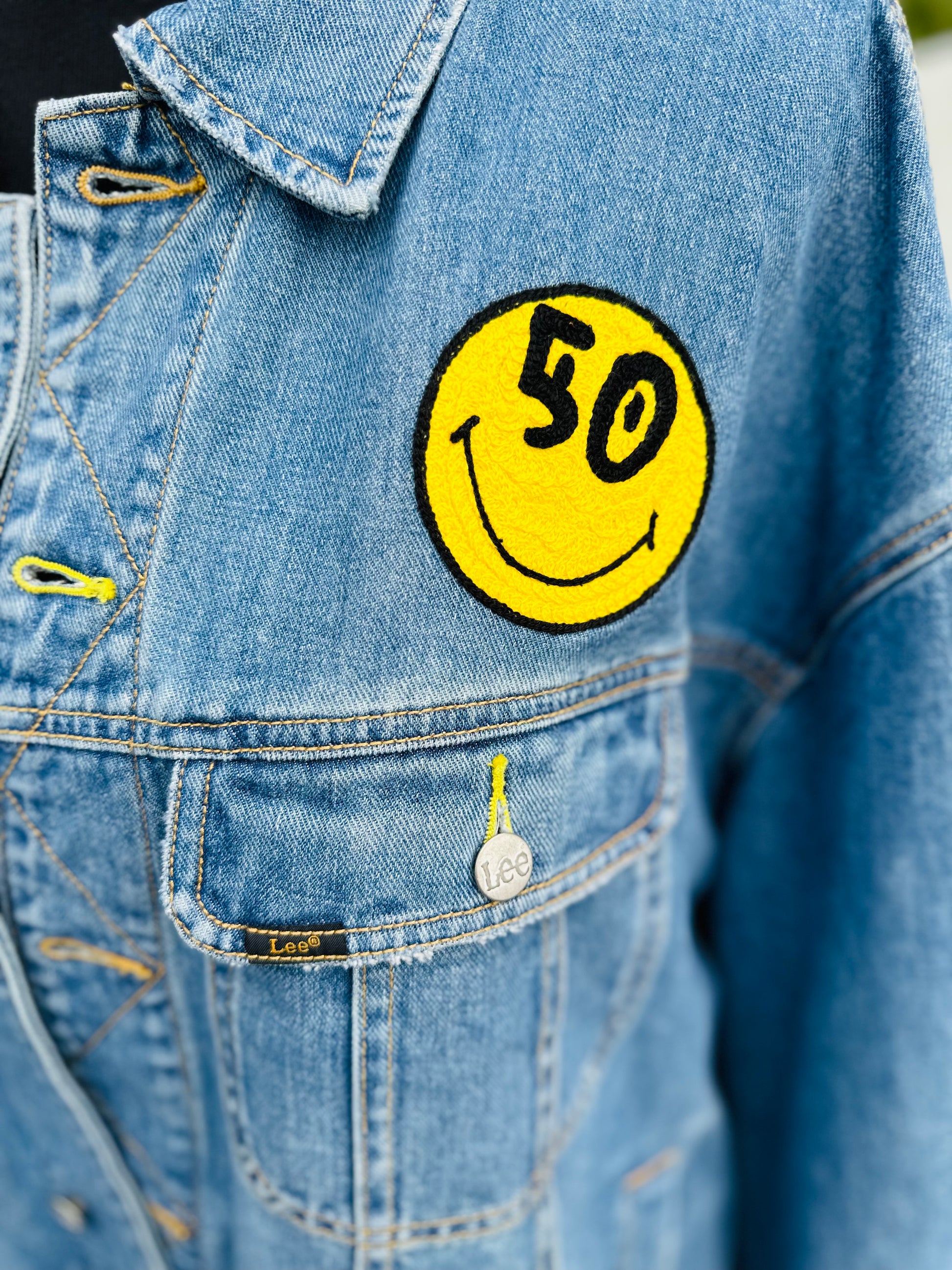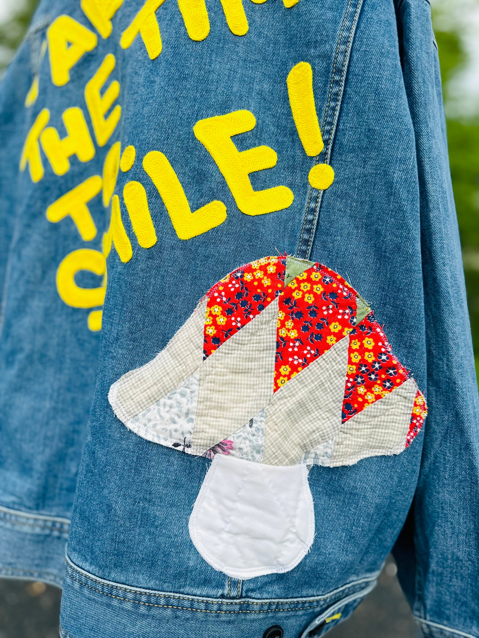 The real show-stealer? A funky quilt appliqué mushroom dancing near the hem — a playful, one-of-a-kind patch that gives full-on retro, handmade magic. Up front, a classic denim fit gets leveled up with a cheerful yellow smiley face patch (yep, it says “50” — because this jacket is ageless, just like your style).